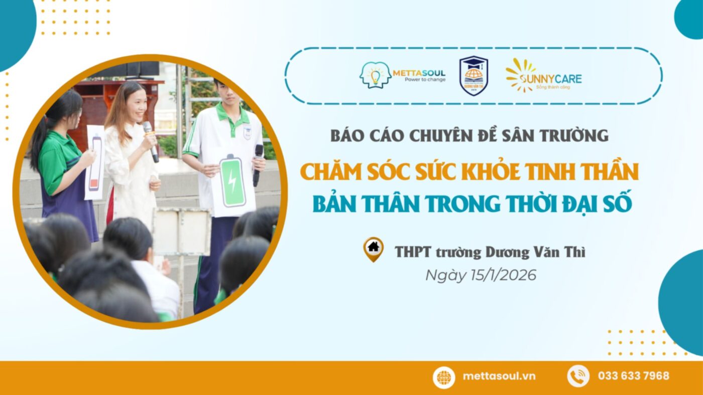 Địa điểm: Trường THPT Dương Văn Thì Thời gian: 7h30 – 9h Đối tượng: Học sinh khối 10 và 11 Báo cáo viên: PGĐ – Th.S Nguyễn Phương cùng đội ngũ trợ giảng của Học viện METTASOUL Khi sức khỏe tinh thần trở thành hành trang quan trọng của học sinh trung học Trong thời […]